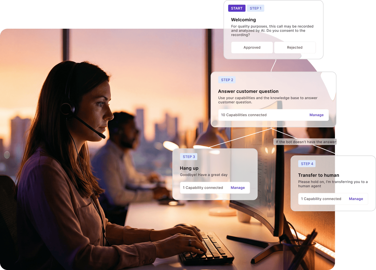 Les parcours clients complexes nécessitent une IA capable de prendre des mesures concrètes. Avec AlloBot, les agents d'IA utilisent des capacités - desconnexions directesà vos systèmes - pour prendre des rendez-vous, vérifier la disponibilité, mettre à jour les dossiers, et plus encore. Les parcours deviennent des flux de travail fluides et exécutables plutôt que des conversations scénarisées.